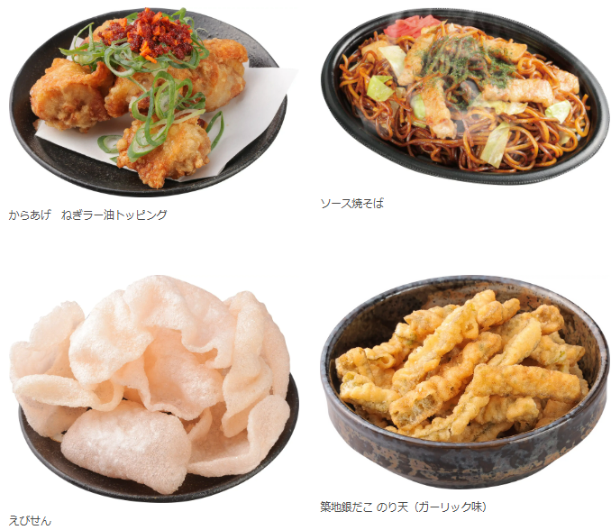 焼そばやからあげ、ねぎと食べるラー油をトッピングした「からあげ ねぎラー油」、ガーリック風味の「のり天」、定番の「えびせん」など、おつまみメニューも取り揃えています。