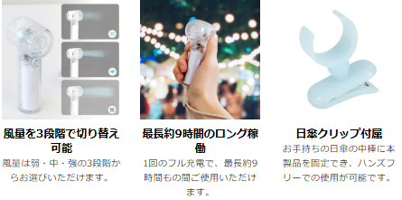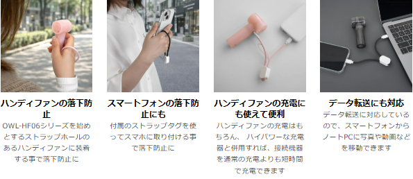 株式会社オウルテックは、日傘に取り付けて使えるジェットハンディファン「OWL-HF06シリーズ」と、充電ケーブルとしても使用できるフィンガーストラップ「OWL-CBX4CC2シリーズ」を発売します。