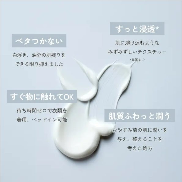 このボディミルクは、そんなストレスを最小限に抑えるよう設計されています。肌にスッとなじみ、塗った後はふわっとやわらかな質感に。これなら、お手入れ後すぐに気持ちよくベッドに入れそうです。